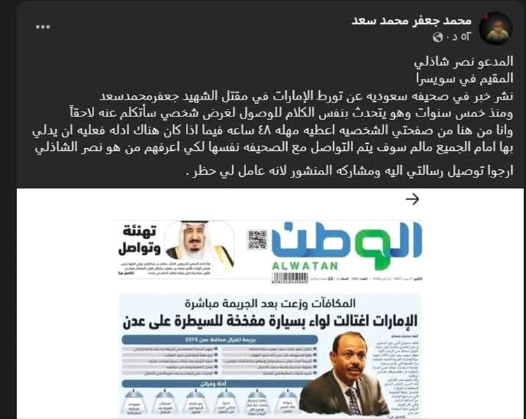 فند نجل الشهيد اللواء جعفر محمد سعد، محافظ عدن الأسبق، ما ورد في تقرير لصحيفة "الوطن" السعودية بشأن مزاعم تورط دولة الإمارات العربية المتحدة